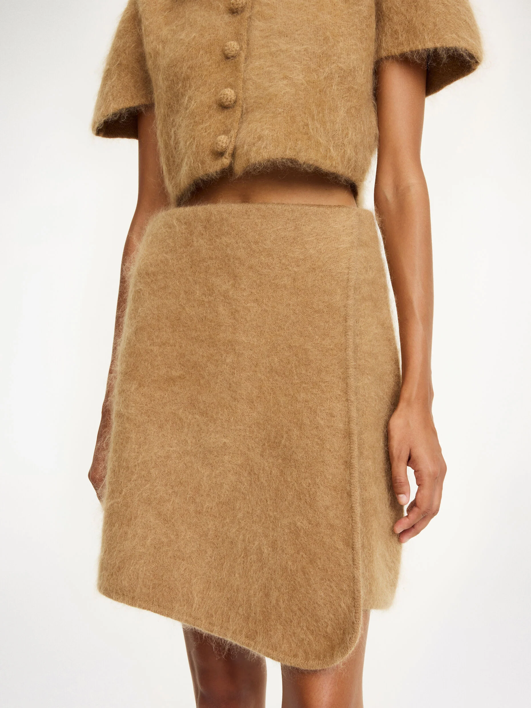 A versatile mini skirt is a foundation piece in any modern woman’s wardrobe – the Krissah design is the warm take for the colder months. The wrap silhouette is crafted in a fluffy mohair-blend fabrication with a hidden elastic waistband for comfort. Style with the cropped Zhara top for maximum coquettish impact.