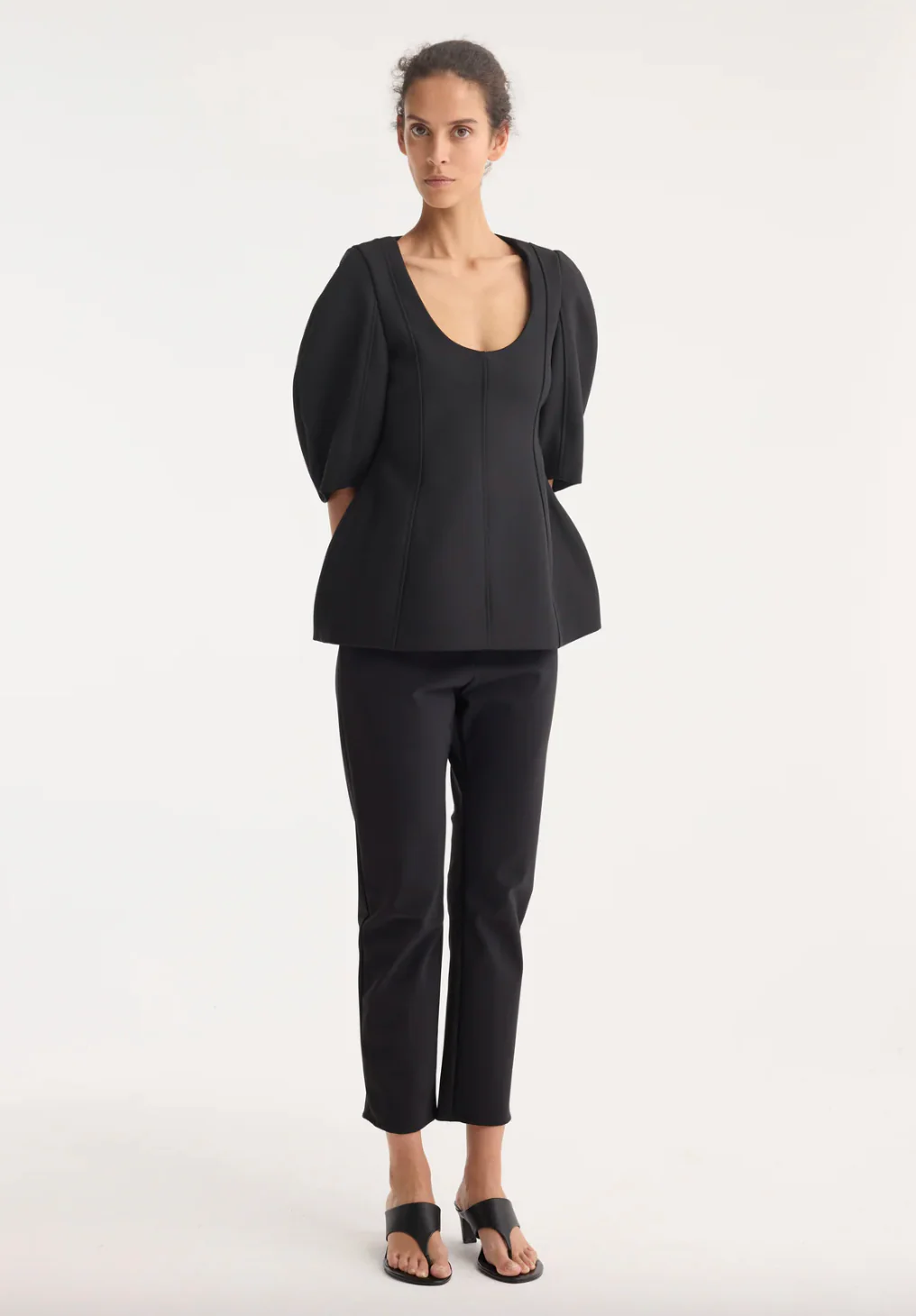 A bold and feminine silhouette, this sculptural top is defined by a deep scoop neckline and voluminous balloon sleeves. The shape flares dramatically from the waist into a structured peplum, accentuated by precise seam detailing for a flattering form.