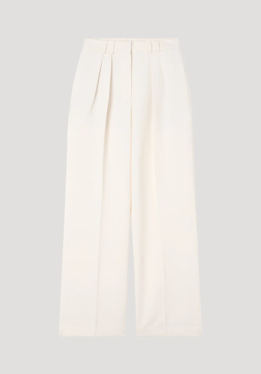 High-waisted double pleated wide leg trousers in a light, modern, clean tailoring quality made from a 100% recycled polyester for a sharp look.